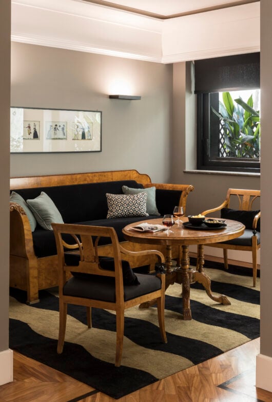 Gli ambienti comuni mescolano arredi di antiquariato siciliano e Biedermeier al design d’autore mentre le camere vantano un progetto di arredo camera e bagno totalmente in situ, con una lettura accurata degli spazi e una realizzazione artigianale.