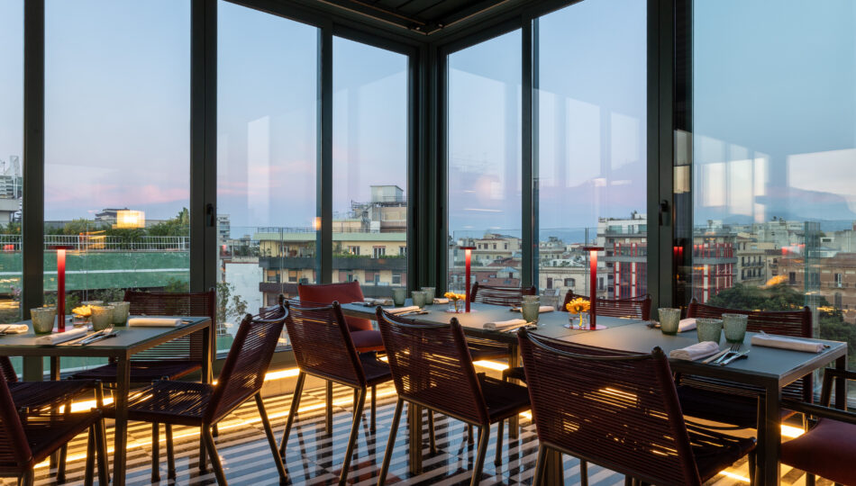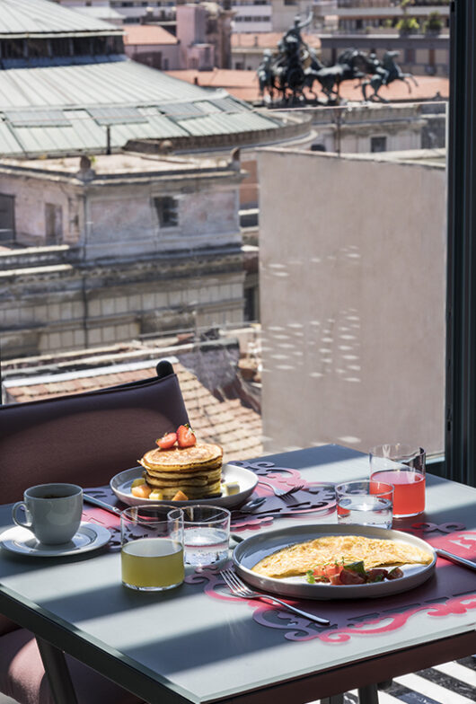 The new rooftop lounge at the eight floor is the most relevant new feature of the hotel after the 2022 restyling. A new spaces facing Monte Pellegrino and Utveggio Castle on one side, and the tips of the mountains circling the Golden Basin on the other, it overlooks the city rootfops and Teatro Politeama Garibaldi with its iconic chariot. This space combines the brightness of an outdoor environment, thanks to its full lenght windows and opening roof, and the comfort of the indoors. The rooftop lounge is where hotel breakfast is served and hosts OVER – Rooftop Restaurant, Mixology and Sushi.